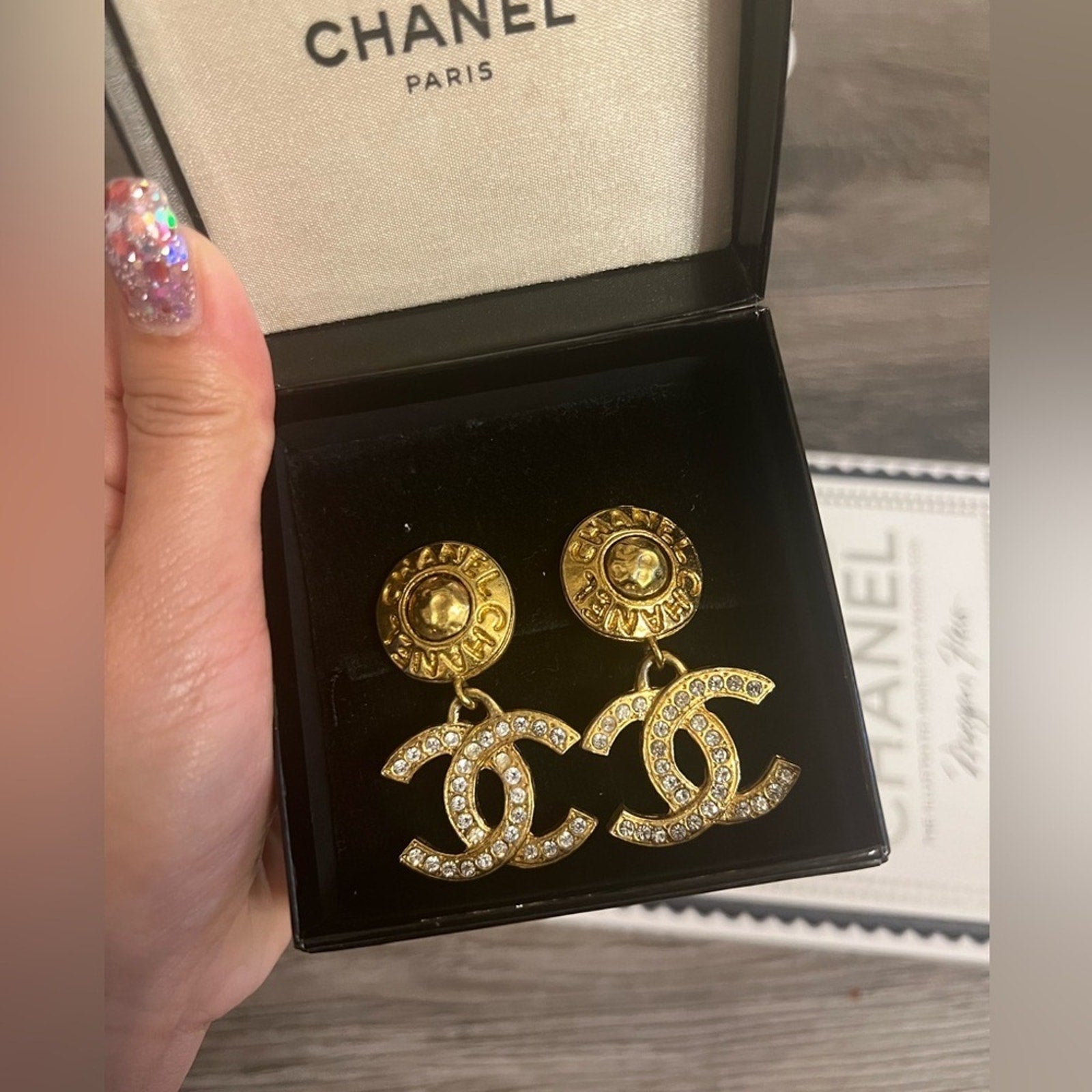 CHANEL Vintage Gold CC Crystal Dangle Clip On Earrings